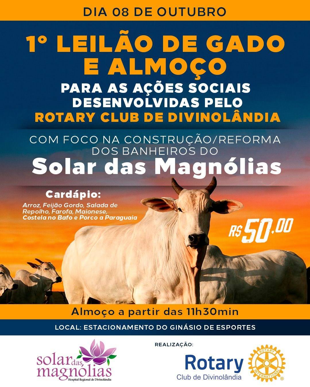 O Rotary Club de Divinolândia promoverá no dia 08 de outubro, a partir das 11h30, o 1º Leilão de Gado e Almoço Beneficente para as ações sociais desenvolvidas, com foco na reforma e construção dos banheiros do Solar das Magnólias. O evento ocorrerá no no estacionamento do Ginásio de Esportes e contará com leilão de gado e de prendas, além de um delicioso almoço. O valor da entrada será de R$ 50,00 (cinquenta reais).