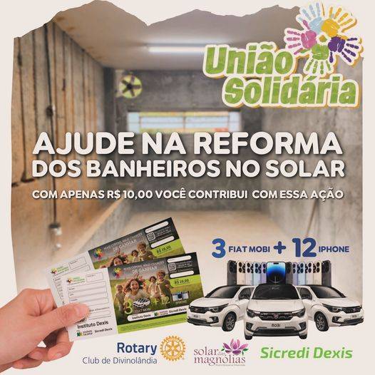 Adquirindo os tickets da campanha União Solidária, você concorre a 3 Fiat Mobi e 12 iPhones. Para participar, basta entrar em contato com os rotarianos de Divinolândia ou inbox nas redes sociais.