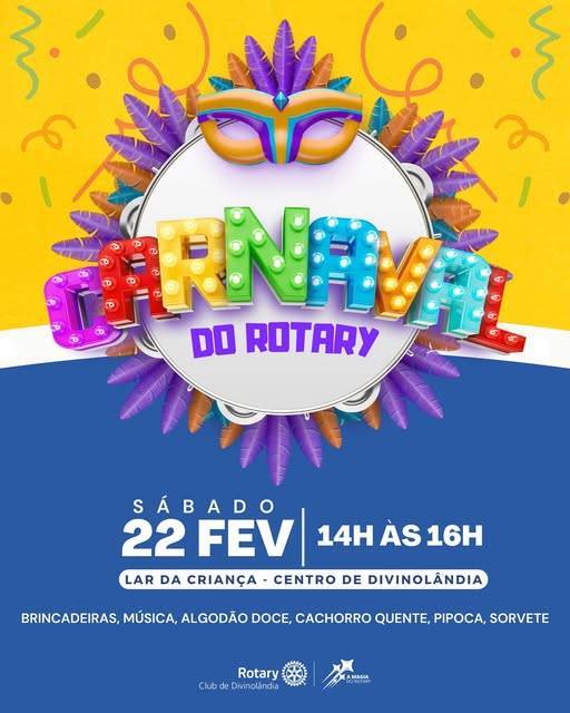 O Carnaval está chegando, e a alegria vai tomar conta de Divinolândia! No sábado, 22 de fevereiro, das 14h às 16h, o Lar da Criança (creche), localizado no centro da cidade, será palco de uma grande festa organizada pelo Rotary Club de Divinolândia. O Bloquinho do Rotary promete trazer muita música, confetes e animação para a criançada!